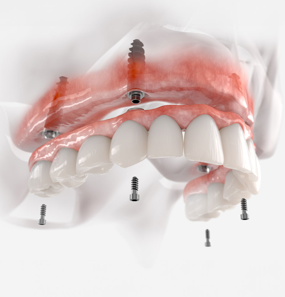 A full, fixed set of teeth offers a permanent solution using the latest dental technology to give you a beautiful smile that’s as good as or even better than the one nature gave you. This option is chip and stain-resistant, doesn’t need to be removed, and is custom-designed to fit securely onto 4-6 implants per arch.